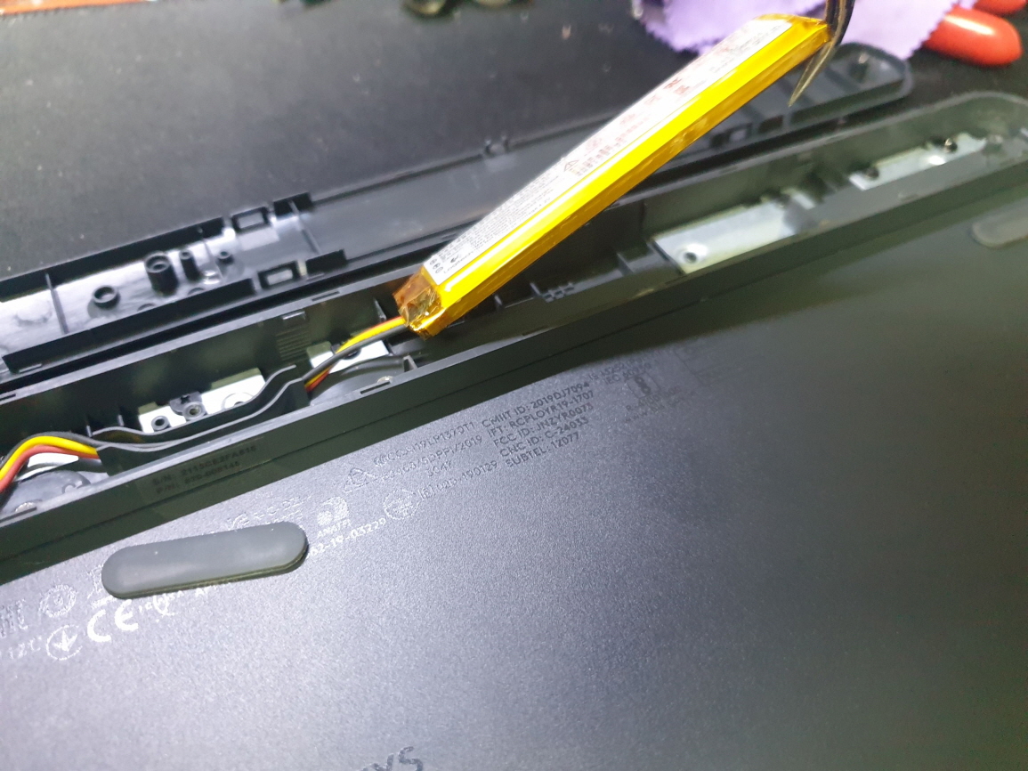 R 키 불량으로 수리 진행합니다. 배터리고정부분의 접착력이 약해 떨어져 흔들면 둔탁한 소리가 나 고정하고 마무리합니다.