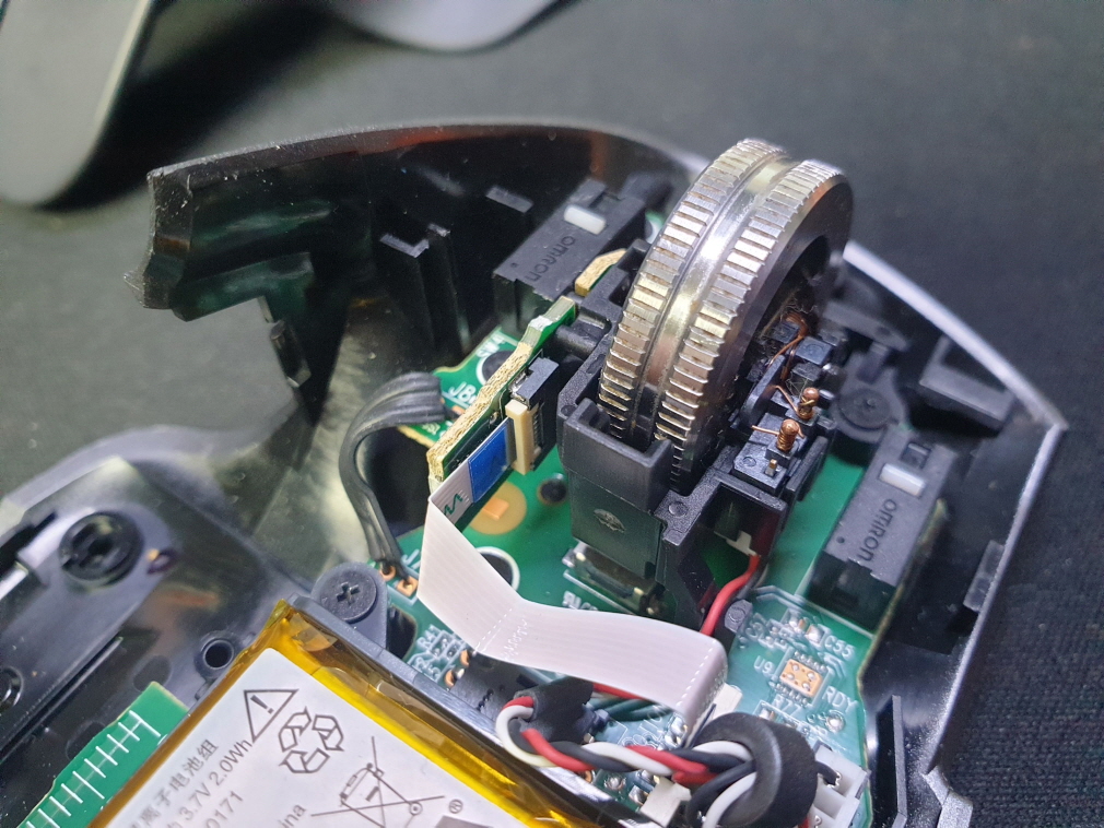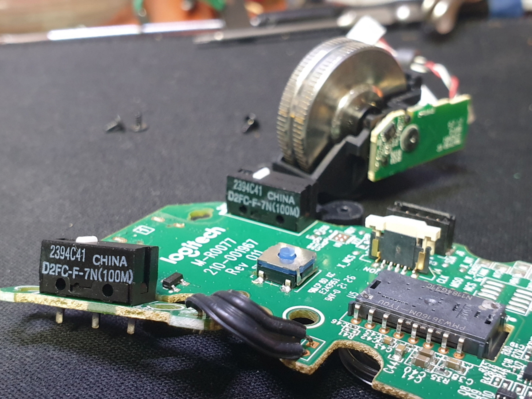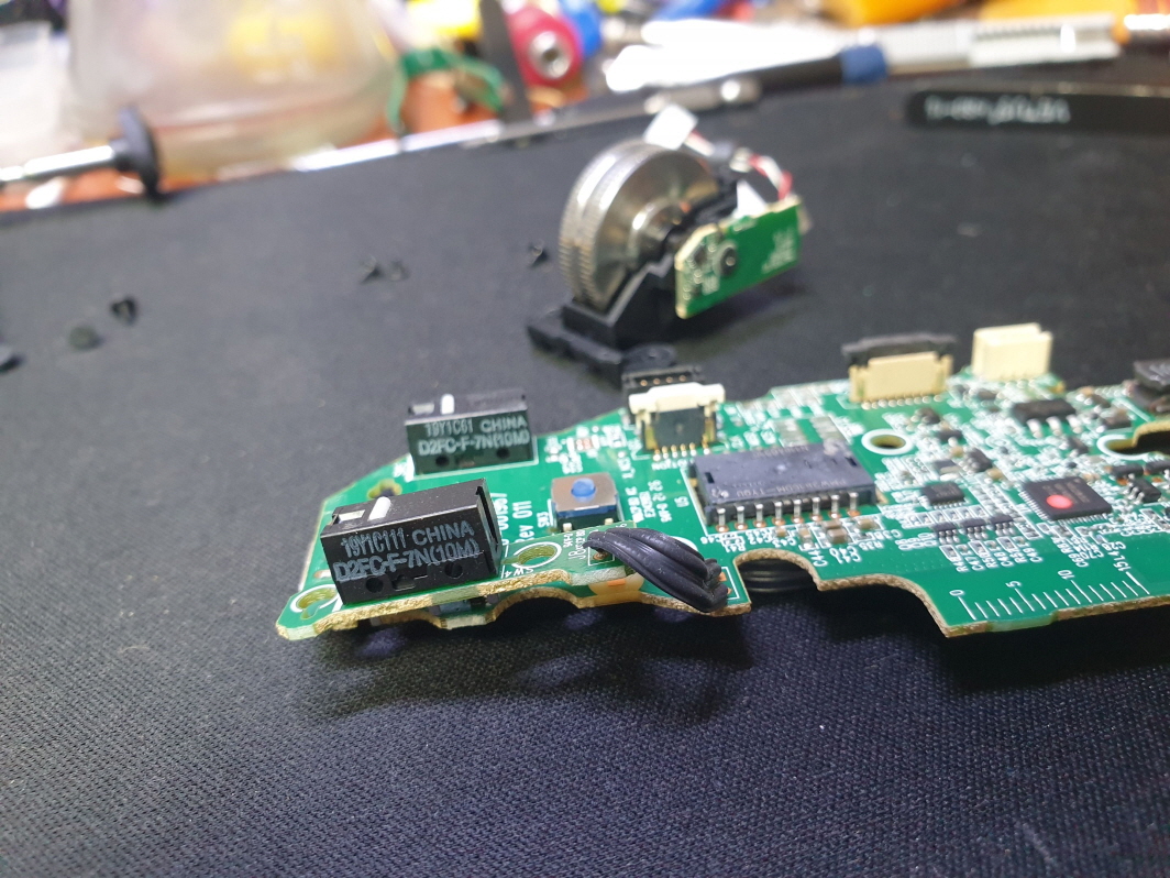 왼쪽 버튼 더블클릭증상인 버튼내 스위치불량으로 새 스위치 D2FC-F-7N(100M) 좌우교체 수리 진행합니다.