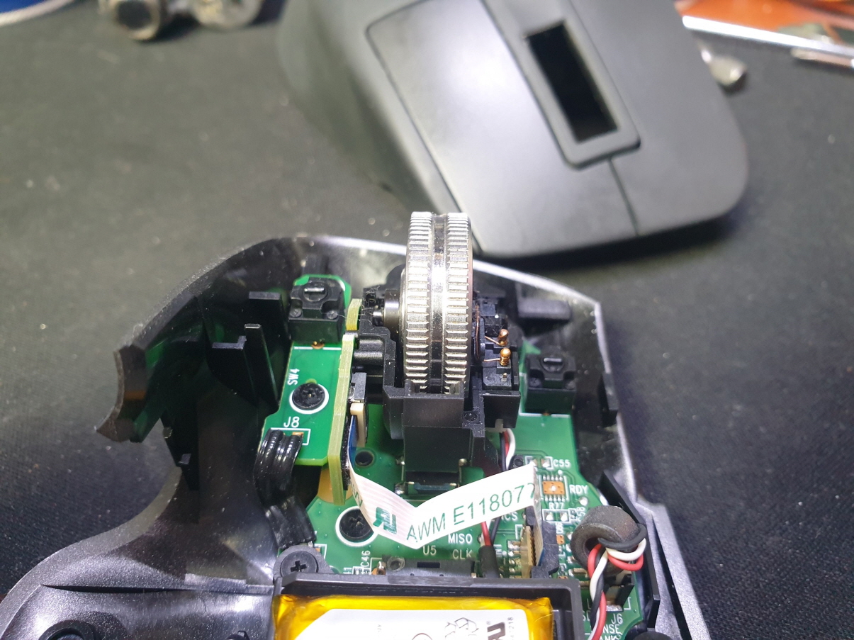 휠센서불량으로 휠센서교체수리 진행합니다. 휠센서불량은 휠팅김, 스크롤시 위아래로 잘 안움직이거나 아예 반응이 없는 경우 발생되는 현상이며 센서교체후 정상적인 사용이 가능합니다.