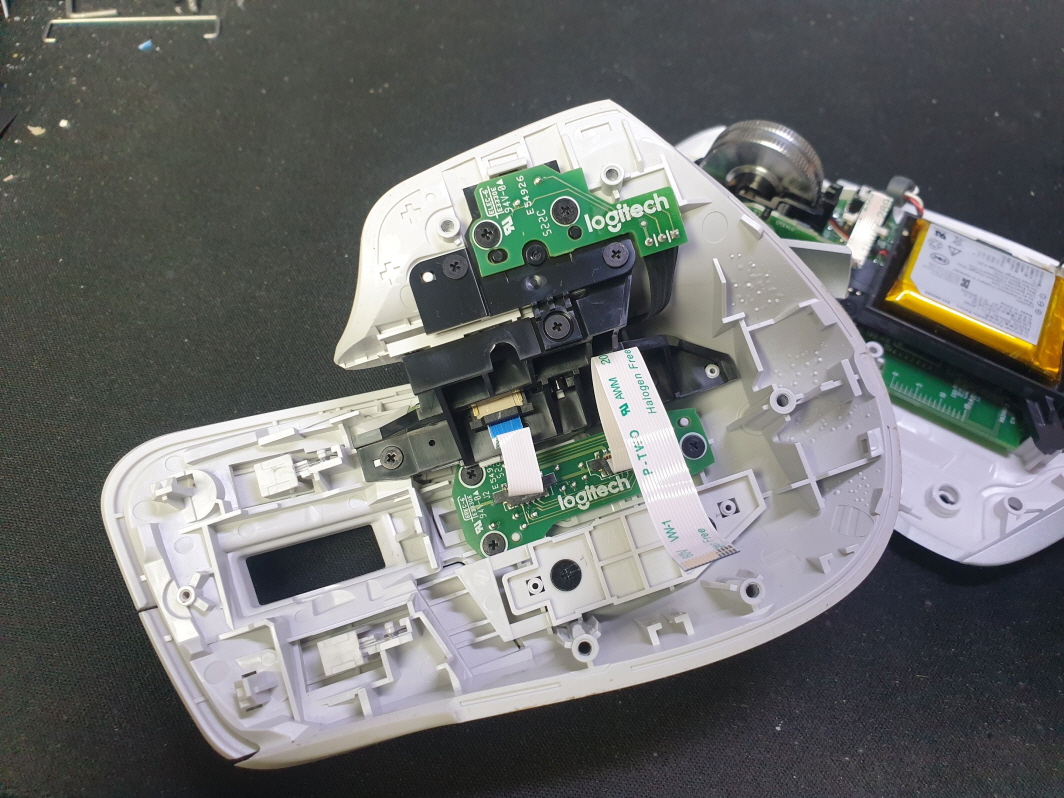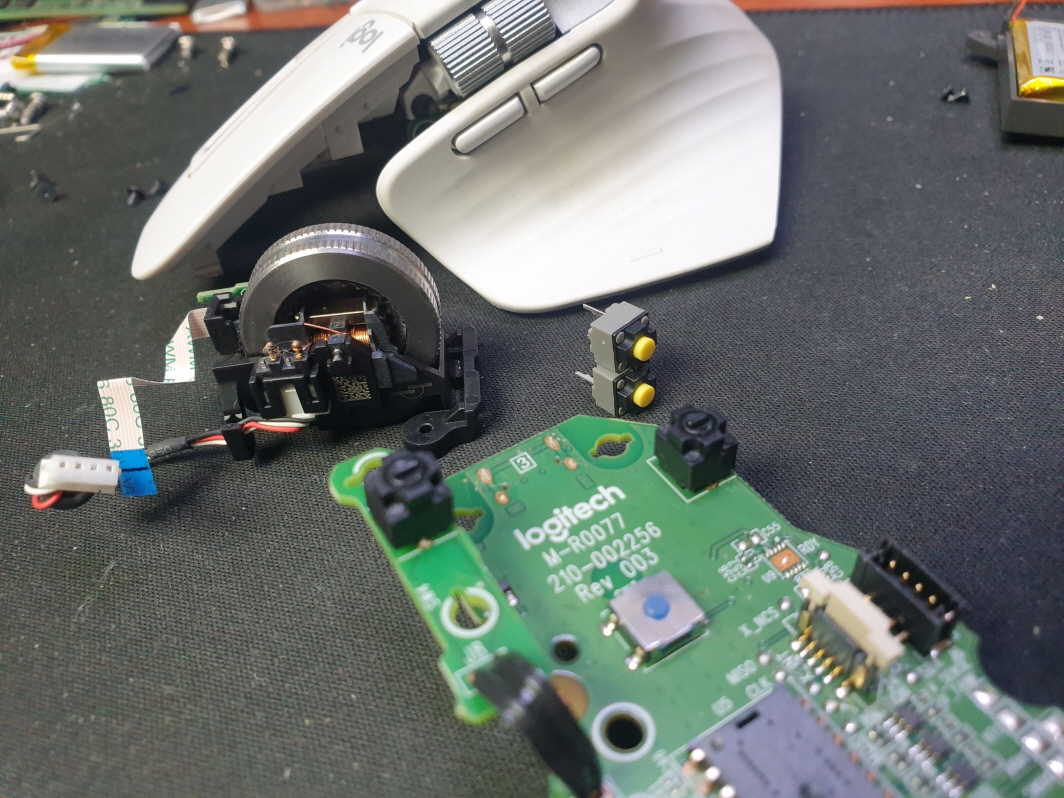 좌버튼 드래그 잘안되거나 풀림 증상인 버튼내 스위치불량으로 새 스위치 카일 저소음 옐로우스위치 좌우교체 수리 진행합니다.