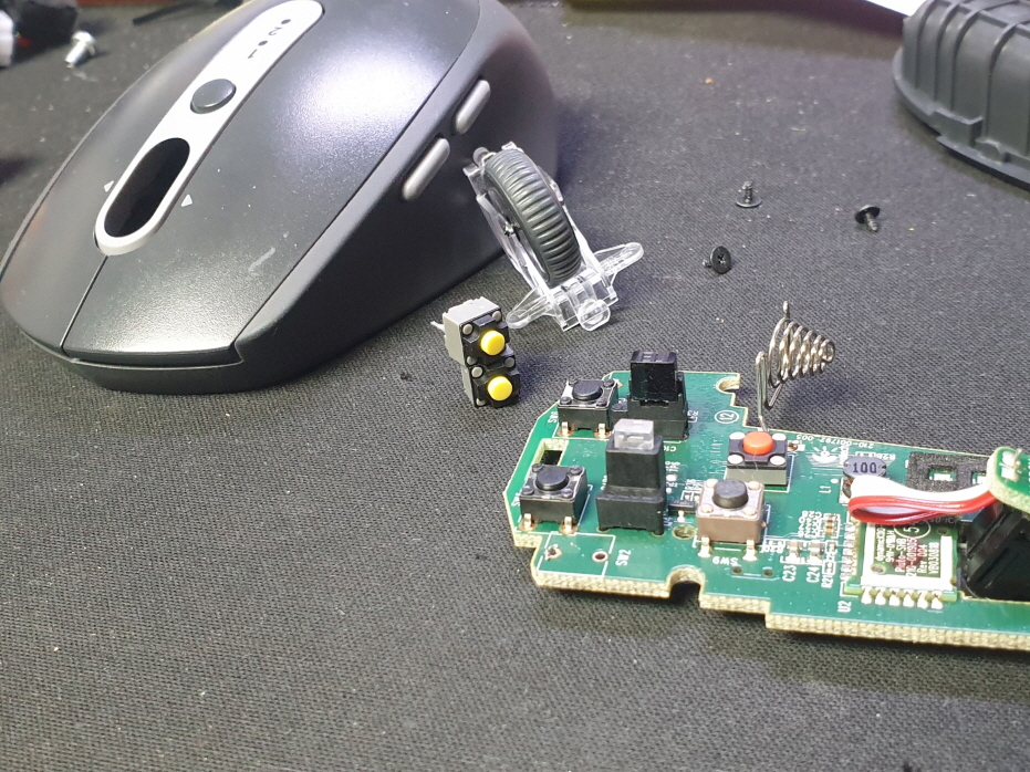 오른쪽버튼 간헐적 안눌림 증상인 버튼내 스위치불량으로 새 스위치 카일 저소음 옐로우스위치 좌우교체 수리 진행합니다.
