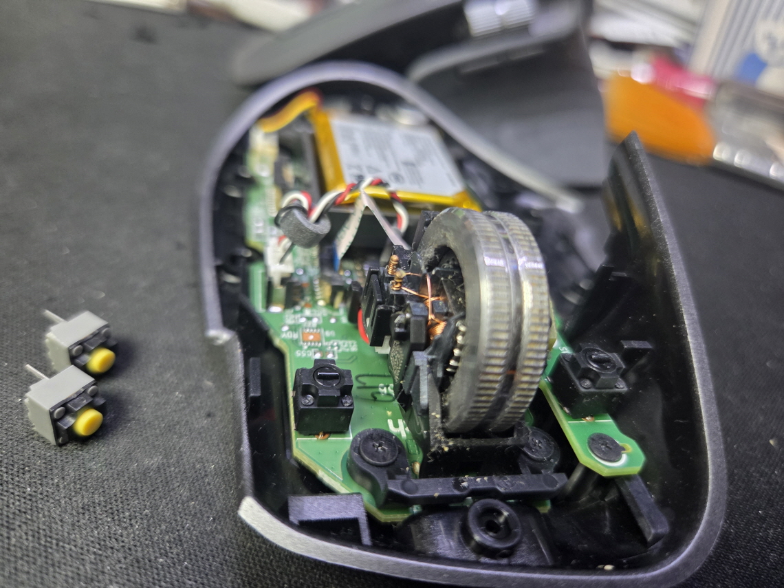 왼쪽버튼 안눌리는 문제인 버튼내 스위치불량으로 새 스위치 카일 저소음 옐로우스위치 좌우교체 수리 진행합니다.